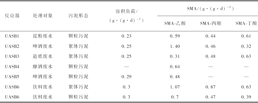 表2 UASB 反應(yīng)器處理不同廢水的表觀產(chǎn)甲烷活性對比