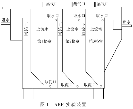 ABR 采用厚為5 mm 的有機玻璃板加工制成,尺寸為455 mm × 150 mm × 400 mm,有效容積為21L,置于(35 ± 1)℃ 的恒溫箱中。反應器分為3 個格室,按照前后順序分為格室1、格室2、格室3,分別命名為C1、C2、C3,每個格室由上、下流室(體積比為3 ∶ 1) 組成, 折流板底角為45°。格室體積比V1 ∶ V2 ∶ V3 = 1. 5 ∶ 1 ∶ 1。每個格室上部設有集氣口,側部分別設有取水口、取泥口,實驗裝置見圖1。