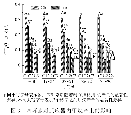 ABR 3 個格室甲烷產生情況,如圖3 所示。在未添加四環素時,格室1、格室2、格室3 的甲烷平均產量分別為0. 320 4、0. 146 2、0. 088 1 L·(g·d) - 1(以MLSS 計)。顯然,甲烷產量在縱向上呈降低的趨勢。這與反應器內的底物分配有關,格室1 進水有機物含量較高,隨著格室內微生物的降解作用,有機物含量在縱向上隨著格室逐漸降低,有機物的減少使得甲烷產量在格室間縱向減小。添加四環素后,格室1、格室2、格室3 的甲烷產量隨著運行時間的推移呈現不同程度的下降,分別是未添加四環素時對應甲烷平均產量的43. 90% ~ 80. 20% 、27. 18%~ 79. 79% 、38. 24% ~ 83. 70% 。通過對比四環素添加后同一個格室不同時間的甲烷產量變化,發現甲烷產量隨著運行時間的推移呈現下降趨勢,說明四環素對產甲烷的抑制作用隨著時間的推移增大。