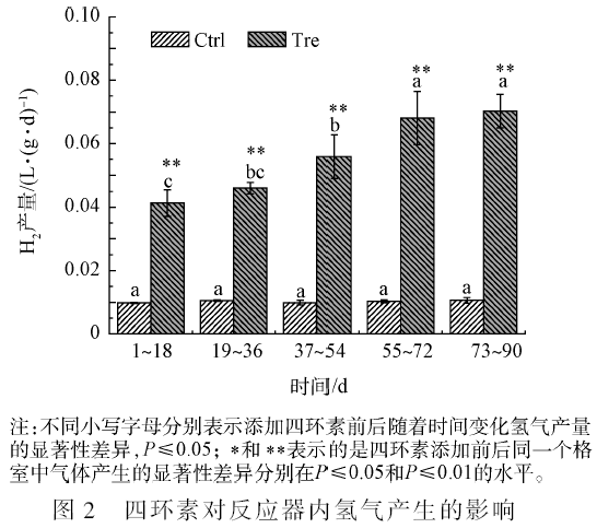 ABR 3 個格室中氫氣的產生情況如圖2 所示。僅在格室1 中檢測到氫氣的存在,而格室2 和格室3中沒有檢測到氫氣的產生,這主要是由于格室1 進行的是產氫產乙酸反應,而后端格室主要進行的是產甲烷反應。未添加四環素運行時,格室1 內氫氣的平均產量為0. 010 2 L·(g·d) - 1 (以MLSS 計)。添加四環素后,氫氣產量是未添加四環素時氫氣產量平均值的4. 05 ~ 6. 89 倍。說明四環素的添加能使氫氣產量增加。
