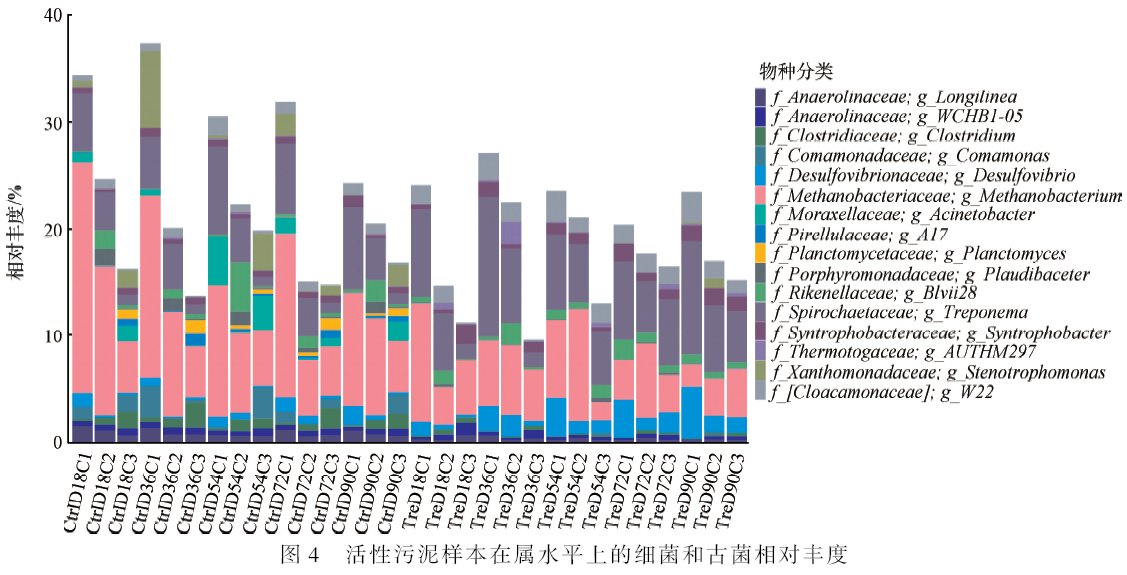 通過反應器中獲取的DNA 序列與GreengenesOTU 數據庫進行比對,得出反應器中微生物主要有16 個屬,如圖4 所示。分別為甲烷桿菌屬( Methanobacterium)、密螺旋體屬(Treponema)、寡養單胞菌屬(Stenotrophomonas)、不動桿菌屬(Acinetobacter)、脫硫弧菌屬(Desulfovibrio)、長繩菌屬( Longilinea)、叢毛單胞菌屬( Comamonas )、互營桿菌屬( Syntrophobacter)、梭菌屬(Clostridium)、浮霉狀菌屬(Planctomyces)、Blvii28、Paludibacter、AUTHM297、WCHB1-05、A17、W22。