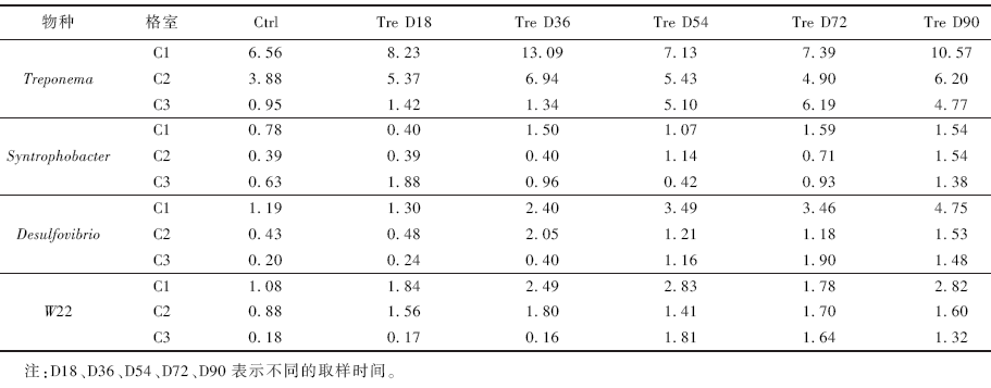 由圖4 可知,隨著四環素的添加,不同物種呈現出不同的變化趨勢。其中,隨著四環素的添加,密螺旋體屬(Treponema)、脫硫弧菌屬(Desulfovibrio)、互營桿菌屬(Syntrophobacter)、W22 的豐度在3 個格室內均呈現增長的趨勢,說明密螺旋體屬(Treponema)、互營桿菌屬(Syntrophobacter)、脫硫弧菌屬(Desulfovibrio)、W22 對四環素具有一定耐藥性。