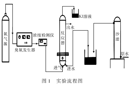 實驗裝置主要由臭氧反應器部分和臭氧發生器部分構成。臭氧反應器直徑為0. 8 m,高為1. 5 m,材質為有機玻璃;臭氧發生器最大產量為10 g·h - 1 ,臭氧濃度檢測儀量程為0 ~ 200 mg·L - 1 。