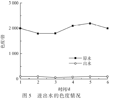 由圖5 可明顯看出,臭氧催化氧化技術對于一級生化出水色度具有良好的去除效果,進水色度平均為2 029倍,而出水色度平均為91 倍,色度的平均去除率可達95% 以上。對于染料廢水來講,色度主要是由其中所含的致色有機物造成,一般致色有機物多帶有發色基團,如偶氮基、羰基、乙烯基、硝酸基、氧化偶氮基等,它們均含有不飽和鍵,臭氧在水中產生的強氧化性自由基可以斷開不飽和鍵,使致色有機物生成小分子酸類、醛類等,從而達到降低色度的效果。