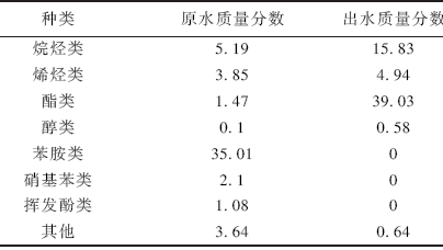 由表4 可以看出,原水含大量的苯胺類物質,達有機物總量的35% ,經過催化臭氧化處理,原水中的苯胺類物質可全部去除;另外,原水還含有一定量的酚類和硝基苯類物質,經過催化臭氧化處理后也全部被分解。根據《污水綜合排放標準》規定,苯胺類、揮發酚、硝基苯類都屬于第2 類污染物,應嚴格控制排放量,經過臭氧處理這些有機物大多數被分解成簡單的酯類和部分鏈狀烷烴類,能被微生物分解利用,有助于后續生化處理,可以表現出廢水可生化性的提高。