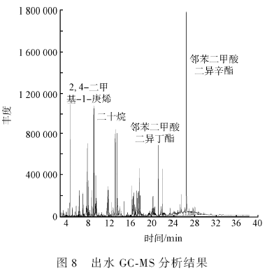將實驗原水和出水進行GC-MS 分析,分析結果如圖7、圖8 所示,其中主要的幾類污染物含量(以質量分數計)見表4。