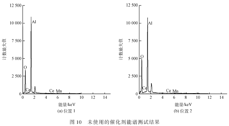 使用電感偶合等離子體發射光譜儀分析使用前后的催化劑,催化劑有效金屬元素為錳和鈰,對這2種金屬元素進行含量分析,結果見表5。