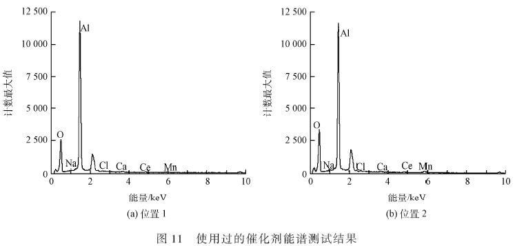 催化劑選用氧化鋁為載體,由表7 數據可以看出催化劑表面含大量Al、O 元素,而有效成分Mn、Ce 元素含量較少且不同位置含量有所差別,說明催化劑表面的活性組分負載并不均勻,日后可以改進完善催化劑制備方法。使用后的催化劑表面能檢測到微量的Na、Ca、Cl 等元素,可能是自廢水中吸附所得,因此建議催化劑在使用過程中定期沖洗以去除這些微量附著物,以免影響催化活性。