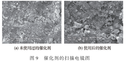 對于使用前后的催化劑進行掃描電鏡分析,根據圖9 可以看出,催化劑表面晶體形態不規則,表面粗糙,有較大的表面積,使用前后形態幾乎一致,沒有明顯的改變。