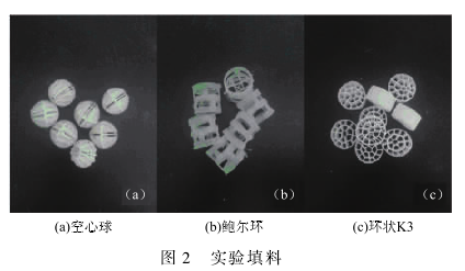 實驗所用各種有機填料如圖2所示。3種有機填料均為聚乙烯材料注塑制成,其中,空心球直徑為25 mm,比表面積為460 m2·m-3,堆積個數為85 000個·m-3 ,鮑爾環為圓柱狀,底面直徑為25 mm,高度為25 mm,壁厚約為1. 2 mm,比表面積為175 m2·m-3 ,K3填料為環狀,底面直徑為25 mm,高度為10一12mm,比表面積為860 m2·m-3 。