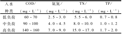 實驗用水采用模擬宜興當地富營養化河水配制,以葡萄糖作為碳源,硝酸鈉和碳酸氫錢作為氮源,磷酸氫二鉀作為磷源。進水各水質指標如表1所示,其中低負荷水質為根據宜興當地富營養化河水實際所測水質配制,中負荷和高負荷水質則分別用于后續實驗中為了測試目標填料對沖擊性進水負荷的反應。其中,各反應器配制低負荷水質下各藥品的用量分別為:葡萄糖2. 5 g,碳酸氫錢740 mg,硝酸鈉790 mg,磷酸氫二鉀320 mg 。
