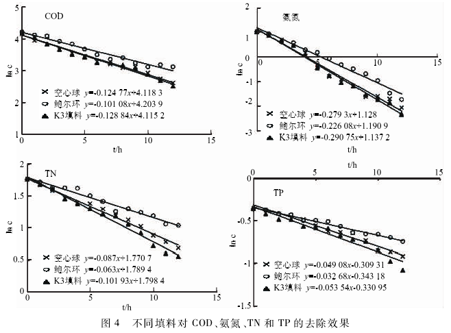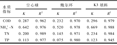 如表2所示,R²基本都在0. 97以上,該組實驗可以較好地擬合一級反應動力學。K值為反應速率常數,其值越大說明各底物的去除速率越大。綜合來看,在實驗條件下,有機填料對COD和氨氮的去除效果較好,但對TN,尤其是TP的去除效果很不理想。鮑爾環對各指標的去除均較差,其K值遠低于另外2種填料。造成這種差異的主要原因是由于鮑爾環的比表面積小,所掛的生物膜量少。環狀K3填料和空心球相比,雖然各指標的去除效果前者略好,但總體而言均相差不大,尤其是對COD和氨氮的去除差別更小。