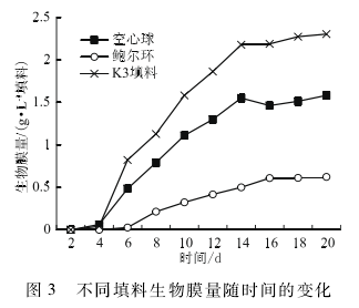 掛膜能力是評價填料的一個重要指標,不同填料由于性質差異,其掛膜速率和掛膜量均有差異,所以實驗首先開展了對于3種填料掛膜性能的研究,運行反應器,各填料在溶解氧濃度為3 mg / L,水溫為20 -22℃的條件下掛膜,其生物膜量隨時間的變化如圖3所示。在掛膜過程中,雖然反應器在第2天就出現渾濁現象,懸浮微生物大量繁殖,但第4天微生物才附著于填料表面生長。各填料自然條件下掛膜均需要約兩周時間,第14天之后,各填料表面的生物膜量趨于穩定,標志著有機填料掛膜成熟,掛膜階段結束。鮑爾環填料掛膜較空心球和K3填料遲緩,生物膜量也較少,穩定后生物膜量僅為0. 6 g / L 填料,掛膜能力較差。空心球和K3填料的終期掛膜量分別為1. 5 g / L填料和2. 2 g / L填料,所以3種填料以K3填料掛膜性能最優。