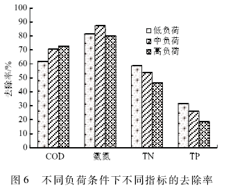 在其他條件不變的情況下,提高進水污染物濃度,研究污染物負荷對空心球凈化效果的影響。如圖6所示,進水COD負荷從平均68. 16增加至151.77 mg / (L填料·d),去除率從61. 80%增加至72. 73 %,反應器的濁度也有一定的增加。雖然污染物負荷增加了,但COD的去除率有所升高,是因為COD的去除主要靠異養菌,從不同水質對掛膜的影響實驗可知,較多的碳源促進了異養菌的生長。進水氨氮負荷從2. 82增加至4. 22 mg / ( L填料·d),去除率從81. 45%增加至87. 21 %,在一定程度上提高進水的氨氮濃度對硝化作用是有利的,進水氨氮負荷繼續增加至8. 01 mg / ( L填料·d),氨氮的去除率下降至80. 12%,這是由于異養菌與自養菌的競爭所致,較大的COD促進異養菌的生長,硝化菌由于其相對較小的最大比增長速率而在競爭中處于劣勢,使去除率有所下降。隨著污染物負荷的增加,雖然TN和TP的絕對去除量有所增加,但填料對TN和TP的去除率卻隨進水濃度的上升呈現明顯的下降趨勢。這說明對空心球填料的TN和TP有效去除率來說,存在一個合適的TN和TP負荷范圍。