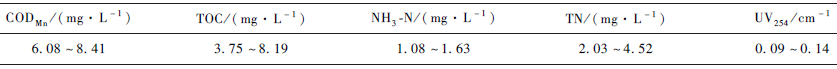 三維熒光光譜采用熒光分光光度計F-7000(日本Hitachi)測量,條件:激發波長λex = 200 ~ 500 nm,步長5 nm,發射波長λem = 200 ~ 500 nm,步長5 nm;狹縫寬度5 nm;PMT 電壓700 V;掃描速度:12 000 nm·min - 1 ;UV254 采用UV-1700 紫外分光光度儀( 日本島津) 測量;TOC、TN 采用TOC-Vcph 總碳分析儀( 日本島津)測量;有機物分子量分布:水樣經0. 45 μm 過膜后,以0. 1 MPa 高純氮氣為動力進行超濾,選用3 kDa、5 kDa、10 kDa、30 kDa 和50 kDa 聚醚砜(PES)濾膜。其他指標按照相關國標方法測定。