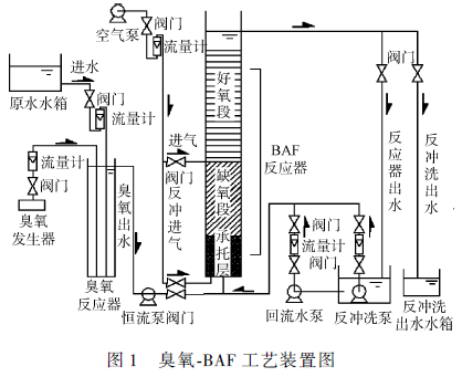 裝置尺寸:BAF 裝置包括缺氧段(A 段) 和好氧段(O 段)。底部A 段高度800 mm,上部O 段高度1 200 mm,構成BAF 處理單元。反應器內徑60 mm,總高度2 500 mm,底部100 mm 裝填4 ~ 8 mm 鵝卵石承托層。