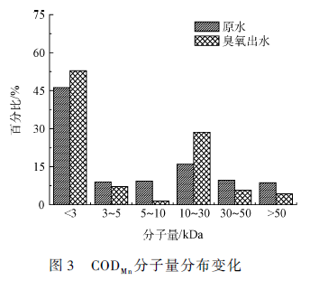 對原水、臭氧預氧化出水進行有機物分子量分級,以對應分子量區間內的CODMn 含量作為百分比,結果如圖3 所示。