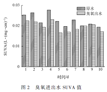 原水經臭氧預氧化后SUVA 的變化如圖2 所示。
