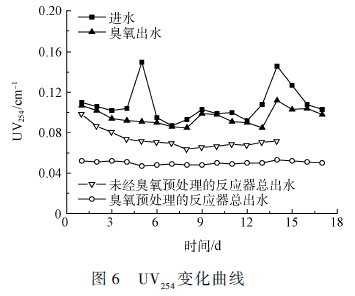 圖6 顯示了原水、臭氧出水以及原水經過臭氧預氧化后BAF 反應器總出水UV254 變化曲線。進水UV254 平均為0. 107,臭氧出水UV254 平均為0. 095,去除率為11% ,進水經臭氧預氧化后反應器總出水UV254 平均0. 050,去除率為53% 。而未經臭氧預氧化的反應器出水UV254 平均0. 072,去除率為33% 。經過預氧化后反應器出水UV254 去除率較未經預氧化的UV254 去除率明顯提高,證明經過臭氧預氧化后,強化了生物處理效果。臭氧預氧化提高了進水可生化性,雖然UV254 仍較高,但增加了水中易被生物降解的物質。進水中UV254 出現2 個峰值,臭氧預氧化后效果較穩定,說明臭氧預氧化有一定的抗沖擊負荷的能力。水樣經過BAF 反應器生物處理后大部分物質被微生物降解,處理效果穩定,出水水質得到提升。