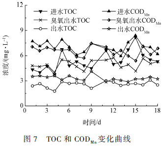 3)臭氧預氧化后BAF 反應器出水TOC、CODMn 和UV254 分別為2. 43 mg·L - 1 、2. 97 mg·L - 1 和0. 05,去除率均大于50% ,NH3 -N、TN 去除率分別91% 、45% ,效果較好,CODMn 、NH3 -N 滿足飲用水水質標準。