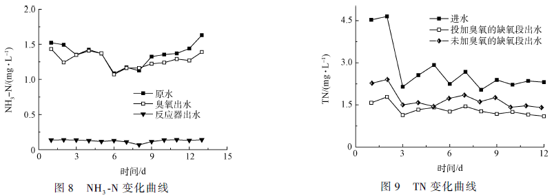 進水、臭氧出水、反應器出水NH3 -N 平均濃度分別為1. 36、1. 28 和0. 12 mg·L - 1 ,去除率分別為6% 、91% 。臭氧預氧化對NH3 -N 去除效果不明顯,NH3 -N 的降解主要在BAF 生物處理階段,主要原因是氨性質穩定,單純臭氧與NH3 -N 的反應速率常數很低,即便與氧化性極強的羥基自由基反應也很緩慢 。生物處理對NH3 -N 降解效果穩定,出水NH3 -N 維持較低水平。反硝化發生在缺氧段,所以重點對比進水、未投加臭氧時缺氧段出水、投加臭氧后缺氧段出水TN 含量。三者TN 平均濃度分別為2. 38、1. 59 和1. 32 mg·L - 1 。臭氧預氧化后缺氧段出水TN 去除率較未經臭氧預氧化的缺氧段去除率提高了36% ?梢姵粞躅A氧化過程提高了缺氧段對TN 的去除效果。具體參見污水寶商城資料或http://www.xhxdt.com更多相關技術文檔。