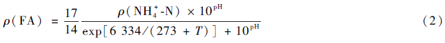 硝化系統中游離氨(FA)的濃度會影響亞硝酸鹽氧化菌(NOB)和AOB 的活性。游離氨濃度的計算公式為: