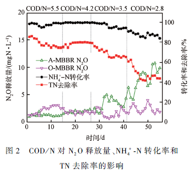 從保證N2 O 低排放和高脫氮效率的角度出發,A/ O MBBR 脫氮系統應控制COD/ N 不低于4. 2。