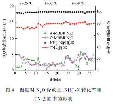 從保證N2 O 低排放和高脫氮效率的角度出發,A/ O MBBR 脫氮系統應控制溫度在32 ℃ 左右。