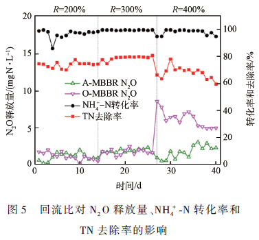 控制回流比,研究A/ O MBBR 系統對N2 O 釋放的影響,結果如圖5 所示。