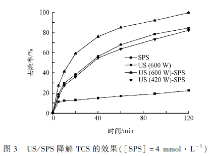 由圖3 可知,單獨(dú)SPS 對(duì)TCS 的去除效果不佳,120 min 時(shí)的去除率僅為22. 3% 。單獨(dú)600 W US 去除TCS 效率較高,120 min 時(shí)的去除率為84. 98% 。在SPS 和420 W US 聯(lián)用下,120 min 時(shí)TCS 去除率為82. 64% ,接近單獨(dú)600 W 超聲去除TCS 的效率,在SPS 和600 W US 聯(lián)用下, TCS 去除率最高,120 min時(shí)達(dá)到100% 。
