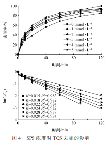 由圖4 可知,TCS 去除率隨著SPS 投加量的增加先增大后減小,當(dāng)SPS 的投加量為4 mmol·L - 1 時(shí),120 min 時(shí)TCS 的去除率最大為100% 。繼續(xù)增加SPS 的投加量至5 mmol·L - 1 時(shí),TCS 的去除率反而下降,120 min 時(shí)的去除率降低為92. 06% 。超聲功率一定時(shí),SPS 投加量直接影響溶液中自由基的濃度,在低SPS 濃度時(shí)增加SPS 濃度,經(jīng)超聲催化產(chǎn)生更多的SO4-·和·OH ,污染物得到快速降解,所以當(dāng)SPS 在4 mmol·L - 1 以下時(shí)增加SPS 的濃度,TCS 的去除率不斷增大,繼續(xù)增大SPS 的濃度至5 mmol·L - 1 時(shí),去除率反而降低原因是SPS 濃度過大時(shí)瞬間產(chǎn)生的SO4-·會(huì)自我淬滅 ,此外過量的S2 O8^2-及其還原產(chǎn)物SO4^2- 也會(huì)與SO4- ·發(fā)生淬滅反應(yīng) ,導(dǎo)致溶液中自由基的濃度降低,TCS 的去除率變小。不同SPS 濃度下TCS 的去除符合擬一級(jí)反應(yīng)特征,反應(yīng)速率常數(shù)的變化與TCS 去除率變化一致,K 值在SPS 的投加量為4 mmol·L - 1 時(shí)最大為0. 028 min - 1 。