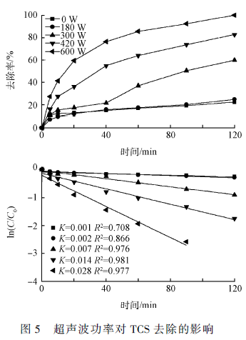 由圖5 可知,超聲功率為180、300、420 和600 W時(shí),120 min 時(shí)TCS 的去除率分別為24. 74% 、59. 7% 、82. 64% 和100% 。在實(shí)驗(yàn)范圍內(nèi)( 0 ~600 W) TCS 的去除率隨著超聲功率的增加逐漸增大。這是因?yàn)橐环矫娈?dāng)聲頻率和聲輻射面積一定時(shí),超聲產(chǎn)生的空化泡內(nèi)的壓力的平方與超聲功率成正比(Pa2 ∝P) ,提高超聲功率會(huì)使空化氣泡內(nèi)的壓力Pa 增大,Pa 增大提高了汽化核因突破空化閾值形成空化泡的幾率,溶液中空化泡數(shù)量增多,空化效應(yīng)得到增強(qiáng) ;另一方面空化效應(yīng)增強(qiáng)使體系中由于水分子裂解產(chǎn)生的H·和·OH 增多,H·和·OH 可與SPS 反應(yīng)生成氧化能力更強(qiáng)的SO4-· ,加速TCS 的氧化降解,且超聲功率的增加會(huì)使溶液攪拌強(qiáng)度以及空化泡在崩潰過程中產(chǎn)生的沖擊波和微射流作用增強(qiáng),TCS 及其降解產(chǎn)物在溶液中傳遞速度加快,與自由基碰撞概率增大,降解效率提高。超聲功率為600 W 時(shí),2 h 時(shí)TCS 能被降解完全,繼續(xù)增大功率可能會(huì)使空化泡在超聲負(fù)相成長過大,空化泡崩潰不充分會(huì)導(dǎo)致超聲的利用率降低。