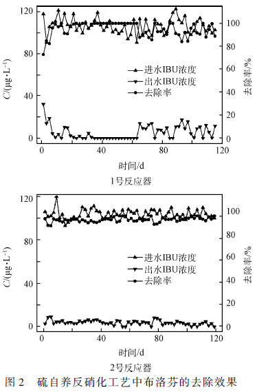 1)硫自養反硝化實驗室小試中,低濃度(100 μg·L - 1 )和高濃度(1 000 μg·L - 1 )的IBU 均能被有效去除,平均去除率> 95% ,說明了該工藝去除IBU 的可行性。