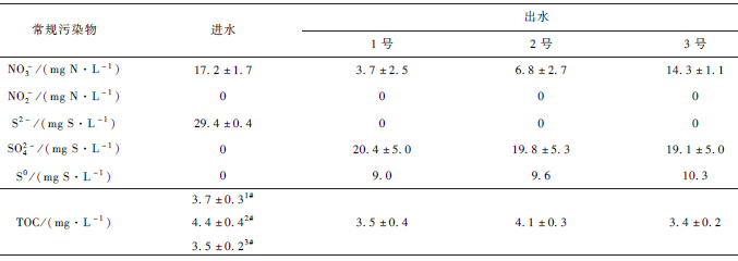 為保證反應器在穩定條件下運行,對反應器運行效果進行長期監測,每周取3 次樣,對NO3- 、NO2- 、S2 - 、SO4^2- 、S0 及污泥濃度進行長期監測。3 個反應器污泥濃度為MLSS = 7. 5 g·L - 1 ,VSS/ SS = 0. 4。反應器系統穩定運行120 d,反應器進出水各硫氮物質的運行效果如表1 所示。其中,3 號反應器為未添加IBU的空白組,其出水中NO3- 含量最高,NO3- 去除效率平均低于20% ,脫氮效率較低。而1 號和2 號反應器均為添加IBU 的實驗組,其反硝化脫氮效果均優于3 號反應器,NO3- 去除效率達到70% ~ 80% 。3 個反應器均沒有NO2- 的積累,且出水中均不存在硫化物,硫化物轉化率為100% 。硫化物在系統中的轉化途徑為:S2 - →S0 →SO4^2- 。3 個反應器出水中SO4^2- 濃度如表1 所示,且多余的硫化物被氧化成了硫單質(沒有檢測出S2O3^2- 、SO3^2- 等中間產物,故根據質量守恒可計算出出水中硫單質濃度)。3 號反應器為未添加IBU 的空白組,S2 - 為反應器系統中唯一的電子供體。從表1 可以看出,3 個反應器進水中65% 左右的S2 -被完全氧化成了SO4^2- ,35% 左右的S2 - 被氧化成了S0 。在3 個反應系統的反硝化過程中,硫化物作為電子供體,提供的電子數量是相當的。而1 號、2 號和3 號反應系統中,參與到反硝化過程的NO3- 分別為79% 、60% 和17% 左右。在硫化物提供相同數量的電子條件下,1 號和2 號反應器中被還原的NO3- 數量明顯多于3 號反應器。因此推測,在1 號和2 號反應器中,IBU 可為自養反硝化反應提供電子供體,促進反硝化脫氮效率。