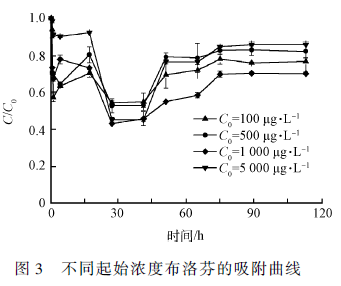 為考察SDB 活性污泥對IBU 的生物降解作用,實驗采用未滅活的SDB 活性污泥來進行研究。其他實驗操作同上述吸附實驗。