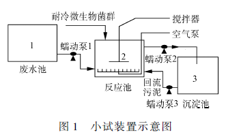 耐冷活性污泥污水處理能力評價自制小試裝置如圖1 所示,包括1 個空氣泵,3 個蠕動泵,體積均為4 L 的廢水池(裝人工污水)、反應池(裝活性污泥并進行曝氣) 和沉淀池(裝處理后的污水并可回流污泥)各1 個。