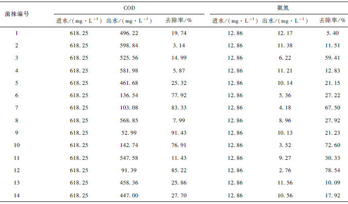 將分離出的14 種單菌株通過測定其5 ℃ 條件下的COD 和氨氮去除率來篩選目標菌株,表3 為處理5d 后的COD 和氨氮測定結果,綜合各菌株的COD 和氨氮的去除率可篩選出6 種優勢菌株,即3 號、6 號、7號、9 號、10 號和12 號菌株。