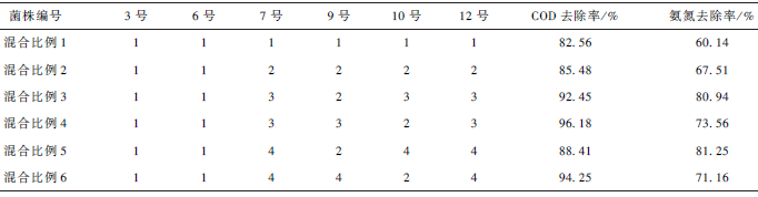 將篩選出來的6 種優勢菌株按照表4 所列的6 種比例混合,測定其5 ℃ 條件下的COD 和氨氮去除率,表中列出了5 d 后各混合菌處理人工污水的COD 和氨氮去除率。實驗結果顯示混合比例3 和混合比例5 可同時保證COD 和氨氮的去除率都相對較高,本實驗最終依據混合比例3 進行菌株混合,然后將混合菌轉入人工污水培養以便后續實驗。