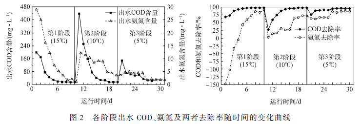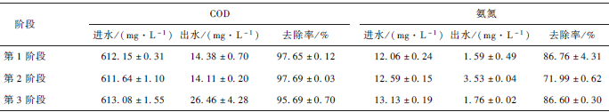 由表5 可知,達到穩定時1 至2 階段的COD 去除率都維持在97% 左右,第3 階段維持在95% 左右;而氨氮的去除率除了在第2 階段時只有72% 左右以外,第1 和第3 階段都達到了86% 以上。