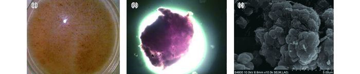 反應器運行初始時所接種的厭氧氨氧化活性污泥的顏色為鮮紅色[圖 4(a)],但隨著K+濃度的增加,在10倍顯微鏡下觀察到,厭氧氨氧化活性污泥的顏色逐漸呈現出暗紅色[圖 4(b)],鹽度增強了ANAMMOX 顆粒污泥的聚集能力,并且隨著K+濃度的提升活性污泥的密度也逐漸增大;實驗結束后在電鏡下[圖 4(c)]觀察可以看到這些細菌呈球形,兩面有火山口型凹陷,推測是典型的厭氧氨氧化細菌,這說明K+濃度的提升不會損害厭氧氨氧化菌的生長.