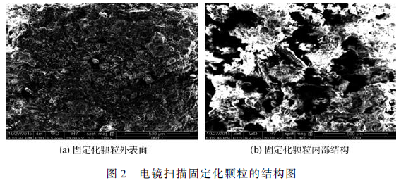 圖2 為固定化顆粒外表面和內部結構成像圖,放大倍數100 倍。經SEM 測定分析顯示,顆粒表面質地均勻規整,孔隙暢通,內部孔隙發達,說明顆粒滲透性好,具有較強的生物活性,能夠滿足基本處理要求。