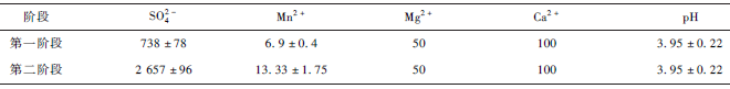 2)提高污染物SO4^2- 濃度到(2 657 ± 96)mg·L - 1 、Mn2 + 濃度到(13. 33 ± 1. 75)mg·L - 1 后,SO4^2- 和Mn2 + 去除率仍可達40. 07% 和20. 52% ,出水COD 濃度64. 07 mg·L - 1 ,TFe 釋放量2. 69 mg·L - 1 ,出水pH 7. 38,說明顆粒對高濃度污染物適應性較強,具有一定的抗沖擊負荷能力。