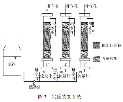 實驗動態柱采用高150 mm、內徑60 mm 的圓柱形有機玻璃管,內部基質填料從下至上為高10 mm 粒徑3 ~ 5 mm 石英砂層、20 mm 固定化顆粒、高10 mm粒徑3 ~ 5 mm 石英砂層,進水采用自下而上的連續運行方式,進水量用蠕動泵和流量計調節控制。固液比為2 ∶ 11。實驗裝置如圖3 所示。共設置3 組動態柱,按不同水力負荷及水力停留時間分為1# 、2# 和3#動態柱,見表1 所示。