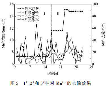 由圖5 可知,早期1# 、2# 和3# 動態柱對Mn2 + 平均去除率分別為17. 16% 、17. 79% 和37. 65% 。KEVIN 等研究表明,Mn2 + 的生物氧化在Fe2 + 存在的情況下很難進行,且Mn2 + 價態不穩定,不易形成穩定難溶的硫化物。因此,Mn2 + 主要依靠改性麥飯石高效的吸附能力去除。麥飯石經改性后內部孔道通暢,比表面積大,具有更好地溶出吸附能力及生物活性,對重金屬離子有較強的吸附性能。在低水力負荷條件下,Mn2 + 的平均去除率高于其余兩柱,這可能是Mn2 + 擴散在顆粒表面和內部孔道同時進行,改性麥飯石內部豐富的孔道對Mn2 + 進行更充分的吸附,去除率較高。后期提高污染負荷,1# 、2#和3#柱平均去除率變為23. 32% 、25. 10% 和20. 52% 。去除率變化程度不大,說明顆粒對高濃度污染物具有抗沖擊負荷能力。3#柱去除率略低于其他兩柱,這可能是由于顆粒前期吸附Mn2 + 過多,使得后期顆粒表面出現吸附飽和現象,導致去除率降低。