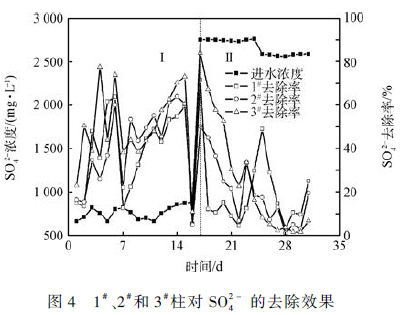 由圖4 可知,早期1# 、2# 和3# 動態柱對SO4^2- 平均去除率分別為48. 03% 、54. 08% 和65. 90% 。實驗前3 d,SO4^2- 去除率緩慢上升,這表明固定化SRB 污泥顆粒逐步適應環境條件,其生活活性處于上升階段。第4 天之后,SO4^2- 去除率急劇上升,原因是此時固定化顆粒內營養物質充足,COD/ SO4^2- 高于理論值0. 67,充足的能源和適宜的碳硫比促進SRB 活性,生物麥飯石活性較高,SO4^2- 還原率總體上達到較高水平。對比3 條曲線,低水力負荷3# 柱對SO4^2- 平均去除率遠高于其余兩柱。這可能是因為較長的水力停留時間使得SRB 還原菌對COD 利用率較高,此時碳硫比最高可達11. 28,固定化SRB 污泥顆粒生活活性較強,達到穩定期,能夠高效進行代謝反應,去除效果顯著。蘇冰琴等 指出適當增加水力停留時間可加快顆粒SO2 SO4^2- 還原速率。后期提高污染負荷,微生物活性受到抑制,1# 、2#和3#柱平均去除率變為26. 88% 、31. 94% 和40. 07% 。3# 柱去除率仍遠高于其余兩柱,表明低水力負荷動態柱對高濃度污染物適應性較強,具有抗沖擊負荷能力。24 d 后,3# 柱SO4^2- 去除率下降到10% 以下,低于其他兩柱。這可能是由于早期3# 柱消耗顆粒內大量營養物質,導致后期內聚碳源COD 釋放量不足,3#柱碳硫比小于0. 02,低于理論值0. 67,SRB 代謝活動受到抑制,固定化SRB 污泥顆粒生活活性降低,進入衰退期,對SO4^2- 去除率下降。