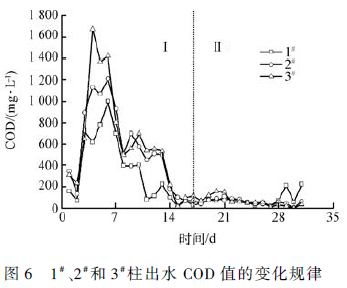 由圖6 可知,早期1# 、2#和3#動態柱出水COD 平均濃度分別為366. 25、581. 88 和635. 06 mg·L - 1 。3#柱COD 釋放量遠高于其余兩柱,這可能是由于固定化顆粒浸泡在水中時間過長,使得內聚營養源有機組分開始泄露,SRB 利用率較低,致使水中COD含量較高。后期提高污染物濃度,1# 、2# 和3# 柱出水COD 分別為78. 47、54. 6 和64. 07 mg·L - 1 ,其中3#柱出水COD 釋放量降幅較大,這可能是由于隨著時間的延長,SRB 對顆粒內聚營養源利用率提高,SRB活性較強,導致出水COD 釋放量降低,表明顆粒在高濃度污染物條件下適應性能較好。