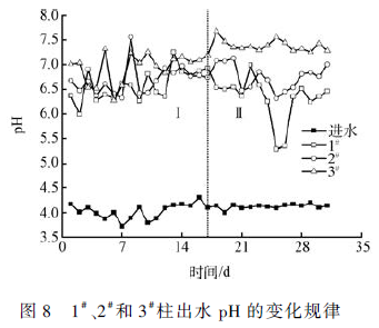 出水pH 值的變化規律如圖8 所示。各動態柱進水pH 值為(3. 95 ± 0. 22),早期1# 、2# 和3# 柱平均出水pH 值分別為6. 57、6. 68 和6. 94。表明固定化顆粒對pH 值有較強的提升能力。這是由于固定化顆粒內鐵屑以及改性麥飯石中的鈣堿性物質能與水樣中H + 反應,迅速提升體系的pH 值 。其中3#柱pH 提升能力最強,這可能是由于3#柱水力停留時間較長,SRB 活性較強,在生物—化學反應中消耗水中更多的H + ,更大幅度的提升pH 值。后期提高污染負荷,1# 、2# 和3# 柱出水pH 變為6. 35、6. 75 和7. 38。3# 柱仍具有較強的pH 提升能力。這可能是由于3#水力停留時間長,此時仍具有較強活性的SRB 異化代謝SO4^2- 的過程中能產生更多的堿度,進一步提升出水pH 值,出水pH 遠高于其余兩柱。具體參見污水寶商城資料或http://www.xhxdt.com更多相關技術文檔。