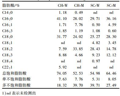 取達到穩定期(第8 d)的微藻測其干重與油脂產量, 并計算其油脂含量, 結果如圖 2所示.對4種微藻的油脂進行甲酯化反應, 通過對生成的脂肪酸甲酯進行氣相色譜分析, 考察4種微藻脂肪酸組成的差異, 結果如表 2所示.