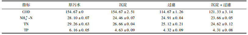 由表 4可知, 城市污水中COD含量經沉淀處理后變化不大, 經過濾、沉淀與過濾聯合處理后降低.城市污水中NH4+-N、TN、TP含量經沉淀、過濾處理后有所降低, 經沉淀與過濾聯合處理后進一步降低.總體而言, 原污水中氮、磷等營養物質較為豐富, 但懸浮物也較多, 隨著處理程度的加深, 懸浮物減少, 但污水中的營養物質損耗也會相應增加.