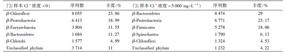 在細菌群中, Cl-濃度為0時的門水平上的主要菌群是β-Chloroflexi(23.86%), β-Proteobacteria(18.99%), β-Bacteroidetes(11.27%), 當Cl-濃度達到5000 mg ·L-1, 占據主體的菌群則變為β-Bacteroidetes(29%), β-Proteobacteria(23.17%)和β-Firmicutes(18.06%).在屬水平上沒有特別優勢的菌屬, 在兩個不同階段優勢最大的細菌分別是Longilinea(7.49%)與Paludibacter(7.69%). Longilinea屬于綠彎菌門(β-Chloroflexi)的厭氧繩菌目(β-Anaerolineales), 可代謝多種碳水化合物. Paludibacter屬于擬桿菌門(β-Bacteroidetes)的紫單胞菌科(β-Porphyromonadaceae), 能發酵多種單糖和二糖產丙酸、乙酸和少量丁酸.當Cl-濃度為0時, 在細菌的測序分析中發現了古菌的β-Euryarchaeota, 因為細菌與古菌的16S rDNA基因序列有較高的同源性, 在對細菌測序分析時也有可能發現古菌, β-Euryarchaeota在Cl-濃度達到5000 mg ·L-1時在細菌的測序中不再占據優勢, 表明鹽度的增高影響了古菌的生長.具體參見污水寶商城資料或http://www.xhxdt.com更多相關技術文檔。
